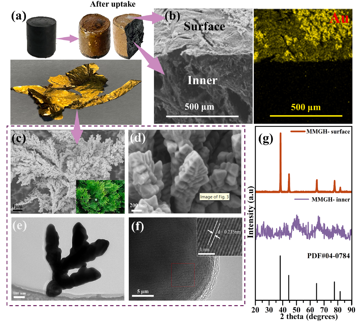 黄金样品。表面快速形成金层MMGH 阻断了水凝胶从外部到内部的通道里面,金只沉积在外面。此外,黄金自驱动磁场产生的富集效应导致反浓度梯度的形成,这可以解释柏叶金形态的形成机制。 这独特的柏叶晶体结构是实现金分离的关键,通过物理方法,解决了强酸高温分离金的问题。