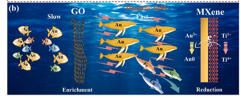 在金的选择性回收过程中,金的成分MMGH 协同合作,优化恢复流程。GO的添加可以减少MXene的堆积,同时赋予MMGH强大的机械性能。 GO展品金属离子富集能力强,但对金没有选择性。提供 MXene MMGH具有选择性吸附和还原金的能力。自驱动磁场加速对流并增强传质,金离子更快速、更均匀地富集MMGH 表面,这使得更多的离子被吸附。 这上述三个组成部分的协同效应使MMGH 能够表现出超高的回收能力和回收的超高纯度
