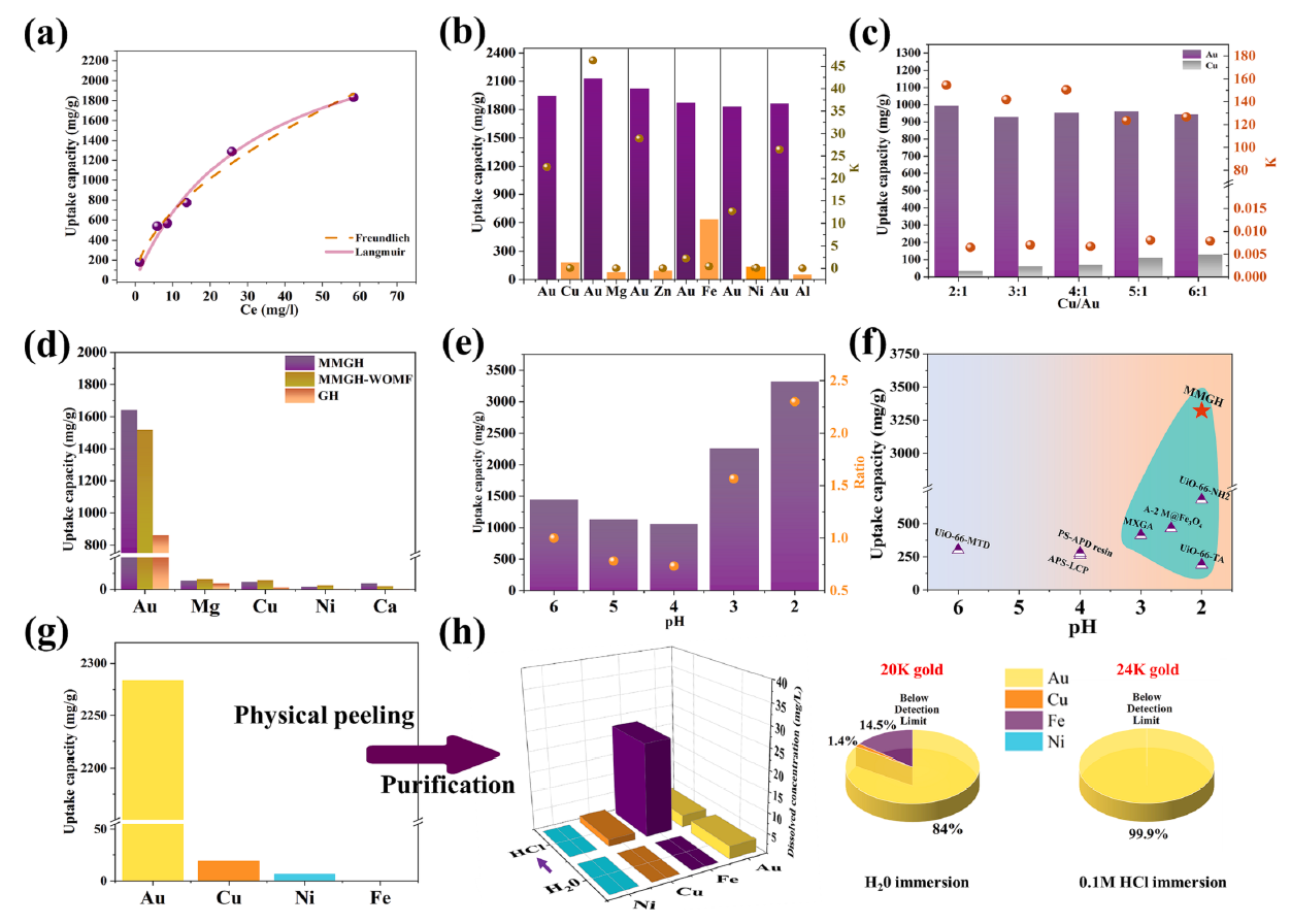 传统金回收存在化学试剂使用过多、金选择性弱、固体吸附剂与金分离困难。这项工作报告了一种自驱动捕获剂,一种磁驱动的MXene/GO水凝胶(MMGH),由Ti3C2(MXene)、GO自交联封装而成和钕铁硼。在这里,我们提供了一种物理剥离金的回收方法,这使得分离加工过程简单,不使用有毒有害化学品。等温线模型拟合证明 MMGH在高酸性环境下表现出优异的金回收性能(2821.8 mg/g),并且金的纯度回收金可达99.9%(24K)。 MMGH 高金装载量的原因是协同三驱动设计材料的系统(磁性/吸附/还原)。 自驱动磁场增强传质,使MMGH 能够快速富集 Au(III),并具有选择性还原能力MXene 的驱动外表面 Au(III) 的还原。 物理分离依赖于形成由于MMGH 的动力学调节,柏叶树突状金结构的形成。 这项研究开创了全链条选择性还原结合物理剥离的金分离回收方法满足工业废液低碳回收黄金的需求。