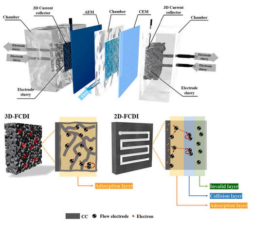 除了提高电极材料自身的导电性、流动性等,还可以优化FCDI装置构型设计以提高系统导电性。集电极是FCDI装置中的一个重要组成部分,它不仅起着电流传输和电荷分布的作用,也是引导碳浆流动的流道。在传统的2D-FCDI系统中,石墨板或钛网通常被用作集电极。然而,有研究表明,在常规的FCDI中,双电层(EDLs)只在靠近集电极的AC上形成。由于电荷渗透不足,大多数没有与集电极相互作用的AC颗粒保持中性,没有得到充分利用。三维电极不仅可以提供大量电子与流动电极颗粒碰撞的机会,还可以避免使用弯曲流道来防止高碳含量造成的堵塞问题。此外,三维导电网络形成了快速的离子和电子传输通道并为离子吸附提供了大量活性位点。