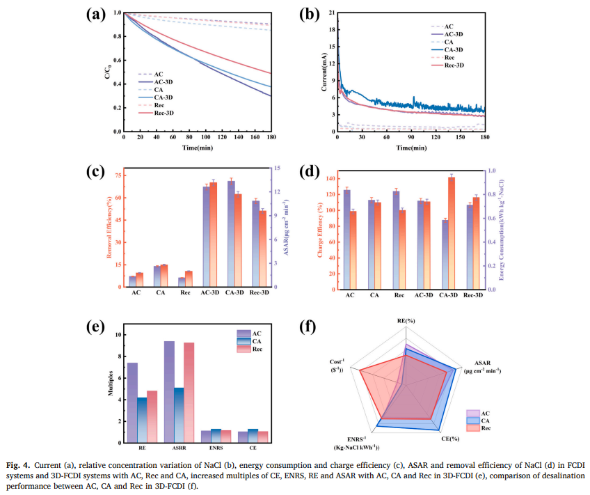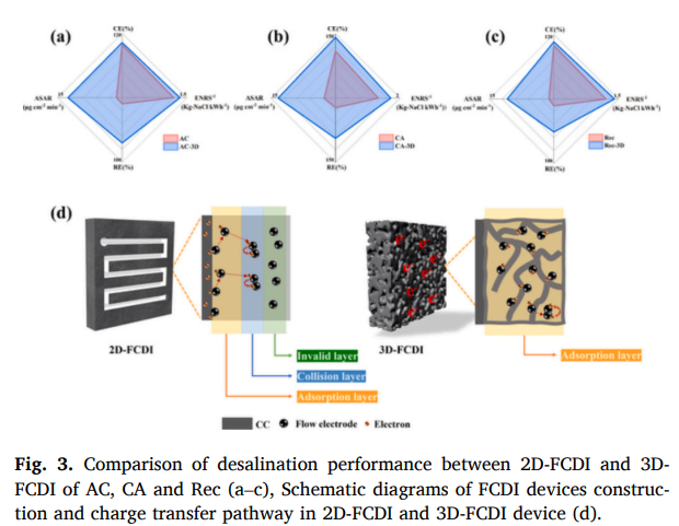 图4a为2D-FCDI和3D-FCDI系统的电流变化图。无论活性材料是AC、CA还是REC,3D-FCDI的系统电流都明显高于2D-FCDI,表明3D-FCDI系统的导电性更好。此外,CA的电流大于AC和REC,这是由于CA具有更好的导电性。正如图4b中的相对NaCl浓度(C/C0)变化所示,2D-FCDI和3D-FCDI系统的出水盐溶液在3小时内都出现了持续的浓度下降。然而,与2D-FCDI系统相比,3D-FCDI系统的出水表现出更大的浓度下降范围。