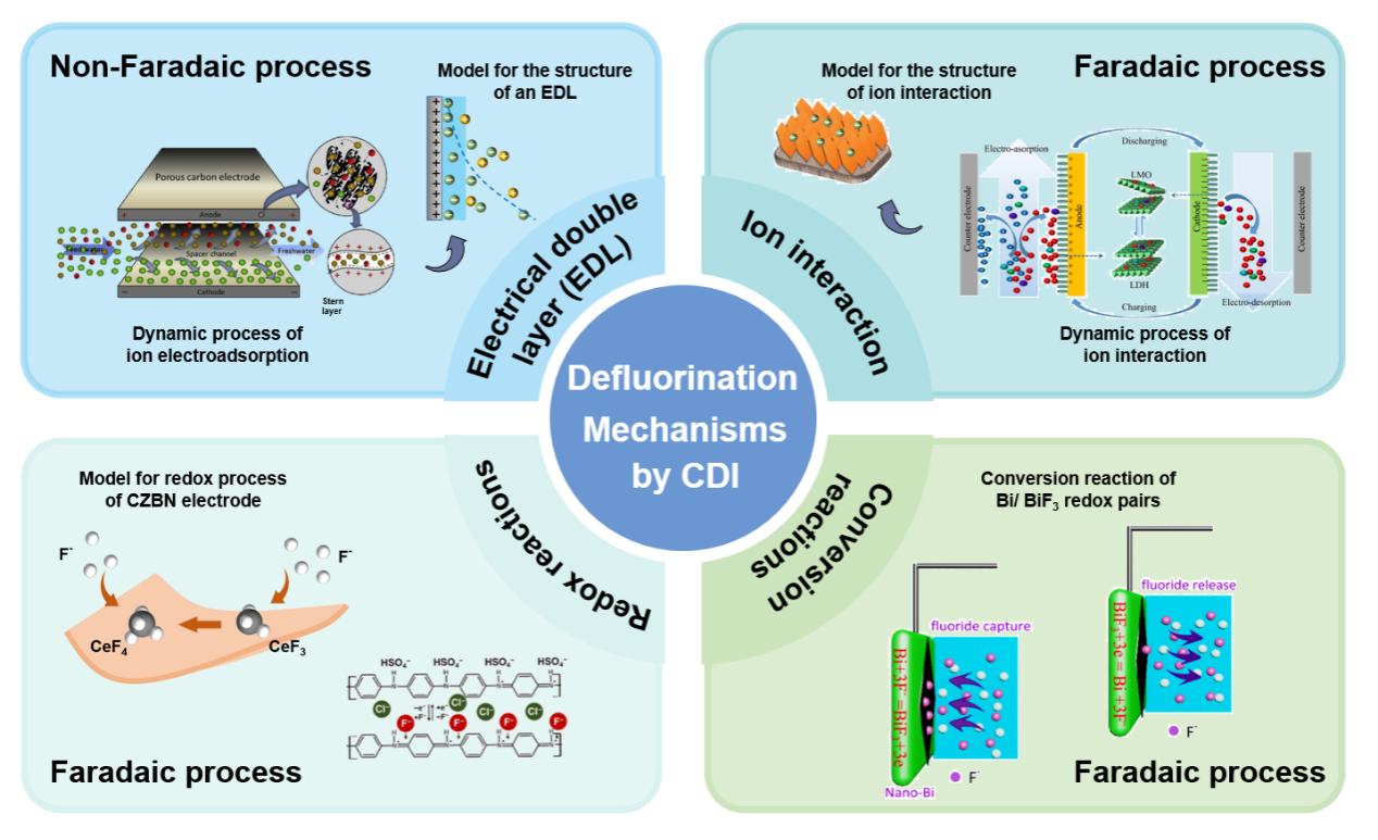随着工业化进程的推进,地表水氟超标污染问题日益严重。长期引用氟含量超标的水会造成各种的健康风险,如神经和肌肉退行性变、骨骼变形、氟骨症和骨质疏松症等。因此地下水中高氟问题是一个环境问题,也是全球人口健康关注的问题。对含氟水的深度处理和低能耗技术的综合需求促使研究人员开发更有效和绿色的除氟方法。其中,电容去离子(CDI)是一种新型的水处理技术,由于其优异的离子选择性,在除氟领域引起了广泛的关注。近几十年来,CDI在电极材料、F-存储机制以及在F-去除领域的工程应用潜力方面取得了显著的进展。然而,缺乏从水中氟离子特性的角度来强调电极材料的设计策略,并为设计具有优异性能和大规模应用前景的CDI结构提供关键因素的见解。