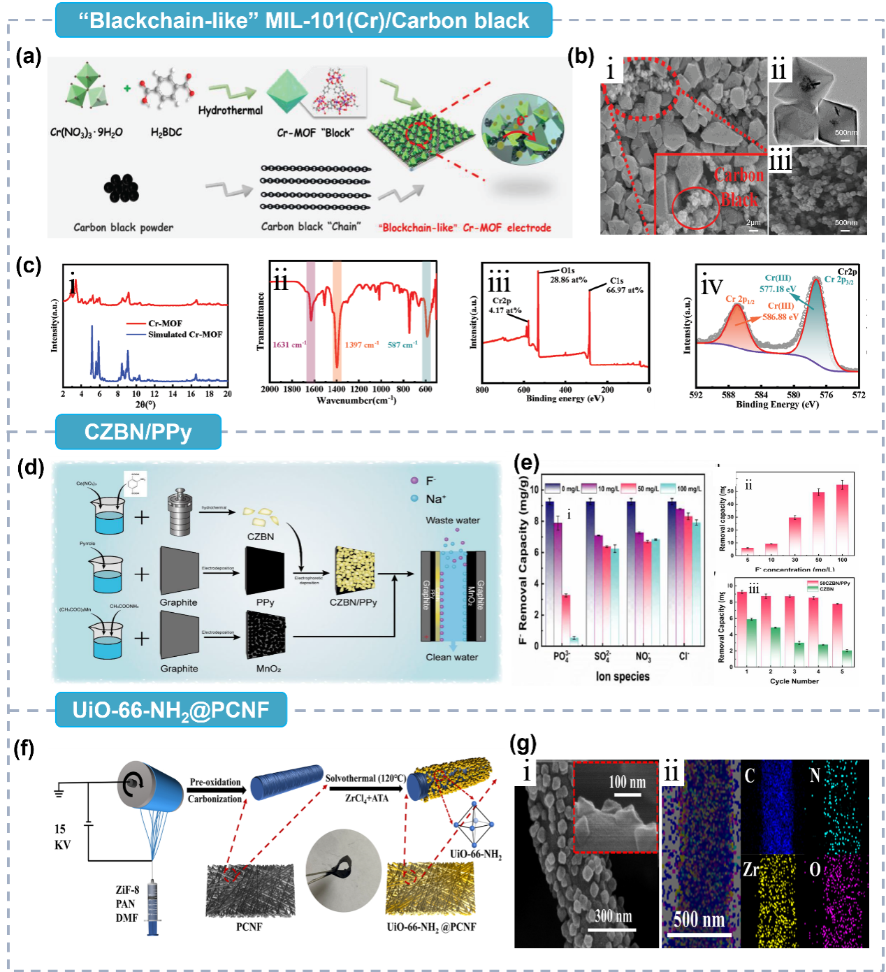 图5Cr-MOF的合成过程(a)、SEM (b)、原理图(c):ⅰ)XRD,ⅱ)FT-IR,ⅲ)实测XPS谱,ⅳ)Cr2p谱[37];合成过程(d),数据图(e):ⅰ)共存离子对脱氟的影响,ⅱ)不同进料F-浓度下的FAC,ⅲ)连续5个CZBN/PPy循环下的FAC;合成过程(f),原理图(g):ⅰ)XRD,ⅱ)EDS表征UiO-66-NH2@PCNF