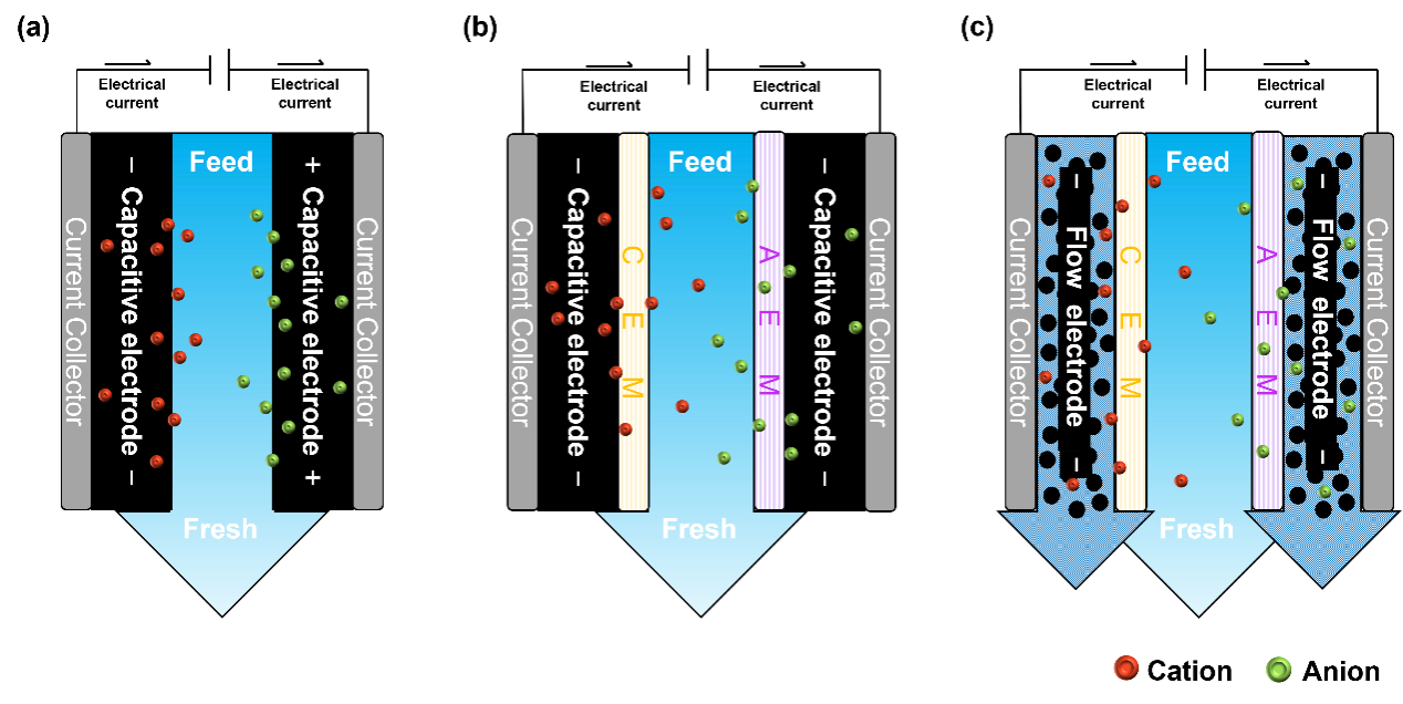 图2CDI (a)、MCDI (b)和FCDI (c)构型的原理示意图