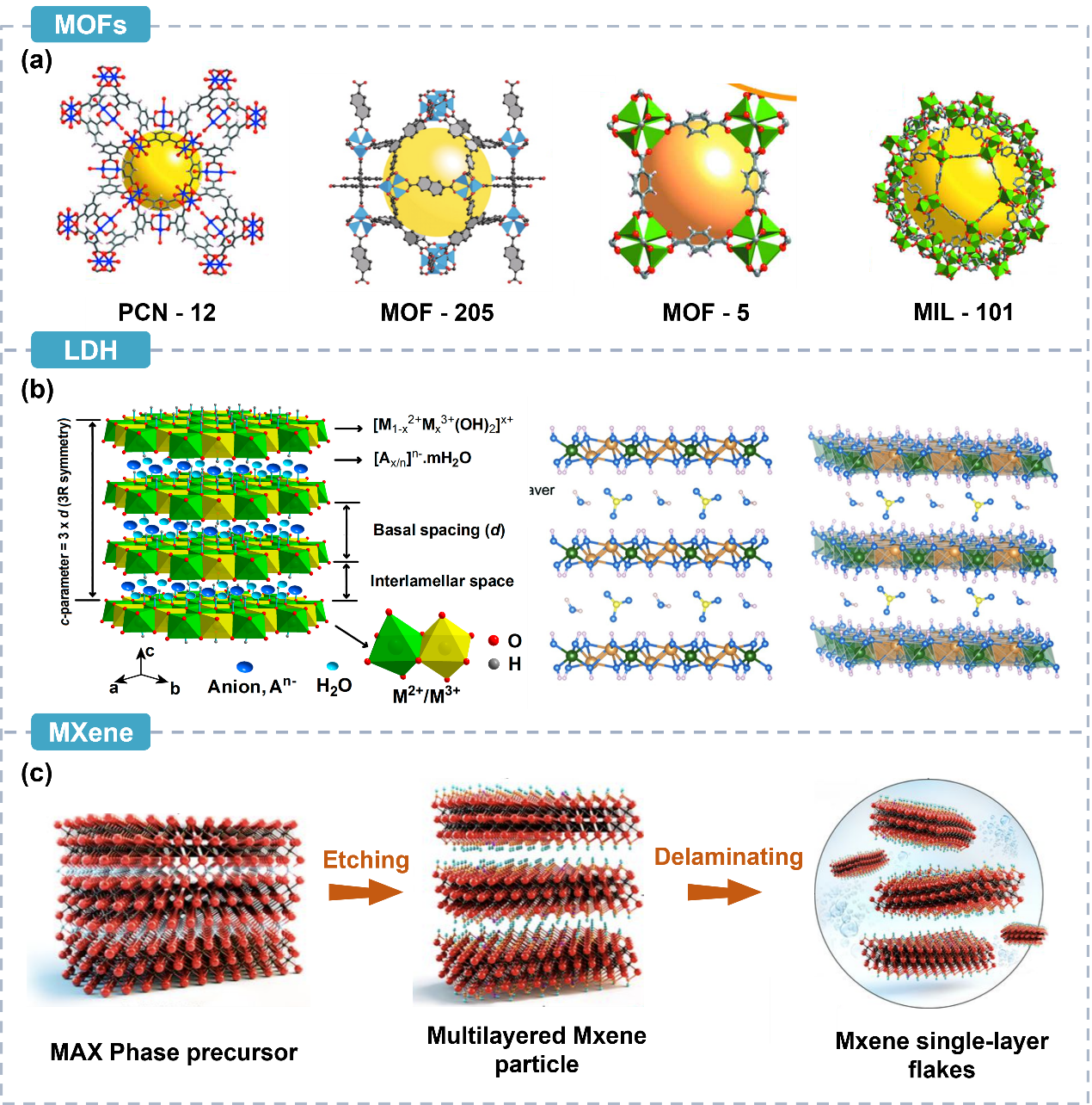 图4MOFs(a)、LDH(b)和MXene(c)结构示意图