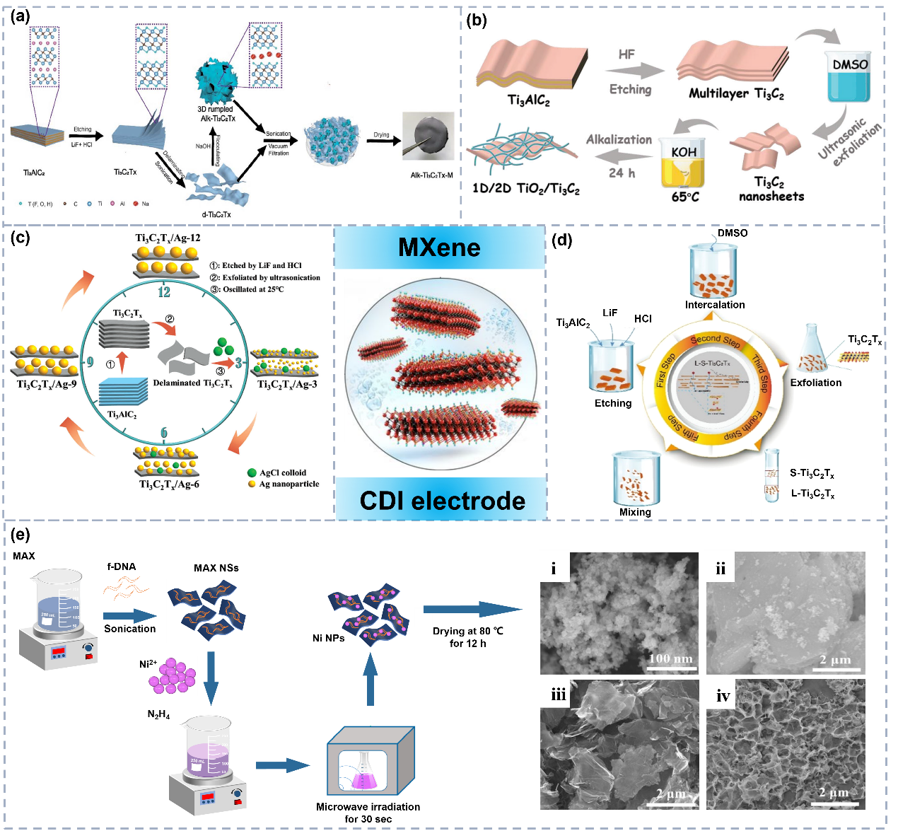 LDH和MXene作为典型的插层材料在CDI除氟领域也已有少量报道,如NiAl-LDH、NiCoAl-LDH、NiFeMn-LDM、Ni/Ti3AlC2等。其中,NiAl-LMO除具有良好的电容去离子性能(最大FAC可达49.28 mg/g)外,还具有良好的稳定性,循环10次后F-吸附率仍保持在最大吸附率的94.4%;NiCoAl-LDH展现出更优秀的循环稳定性,在40次充电循环后除氟容量可达初始的85.2%;Mn金属的引入增强了NiFeMn-LDM对氟离子的赝电容容量。然而,通过综述发现LDH的制备过程通常涉及金属盐溶液共沉淀法或水热法,从环境角度来看,原料的制备涉及到大量金属盐(如铁、钴、镍)的存在,这些金属盐在高浓度时可能对环境具有一定的毒性,极大可能会造成二次污染,因此未来的研究需要着重于通过形态调控或其他途径增强LDH基材料的吸附能力,减少LDH制备过程中可能对环境的影响,解决LDH结构在酸性溶液中的降解问题对于实现LDH作为CDI脱氟电极的潜力至关重要。同样,MXene的制备过程通常需要氢氟酸处理(图6),酸性条件和酸蚀废液的处理都可能对环境产生一定的影响。因此,有必要采用非氢氟酸蚀刻法等措施,以减少对环境的负面影响。如Gong等人采用Lewis酸熔盐蚀刻法成功制备了MXene电极材料。在追求高效除氟性能的同时,可以解决以下研究挑战:进一步提高MXene材料的电化学性能和稳定性;开发具有成本效益的MXene材料制备工艺,降低材料成本;研究不同官能团对MXene材料吸附氟离子的影响,优化表面官能团修饰。