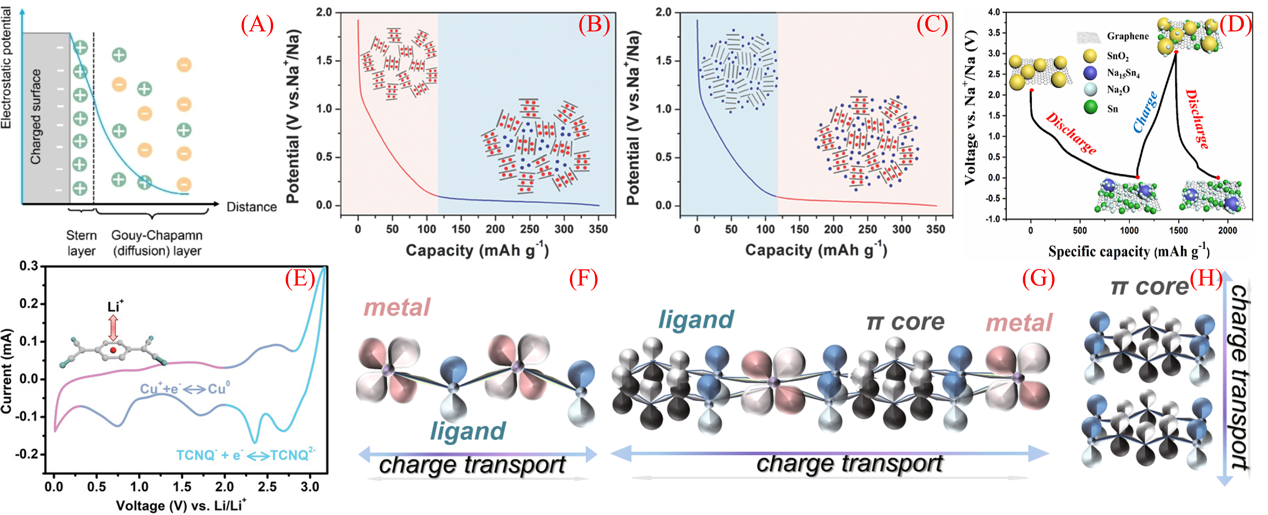 Figure 3. Schematic illustration of the ion storage mechanisms: EDL mechanism based on Gouy-Chapman-Stern model (A), "intercalation-adsorption" mechanism for Na-ion storage in hard carbon (B), "adsorption-intercalation" mechanism for Na-ion storage in hard carbon (C), Schematic for the conversion interaction mechanism of the SnO2@G with Na-ion during discharge and charge processes (D) and redox storage mechanism of Li-ions in MOFs (E); Charge transport pathways of MOFs: Through-bond (F), extended conjugation planes (G) and through-space (H). The "metal" refers to the d orbitals of metals, "ligand" represents the p orbitals of ligand and "π core" means the conjugated π plane of ligand.