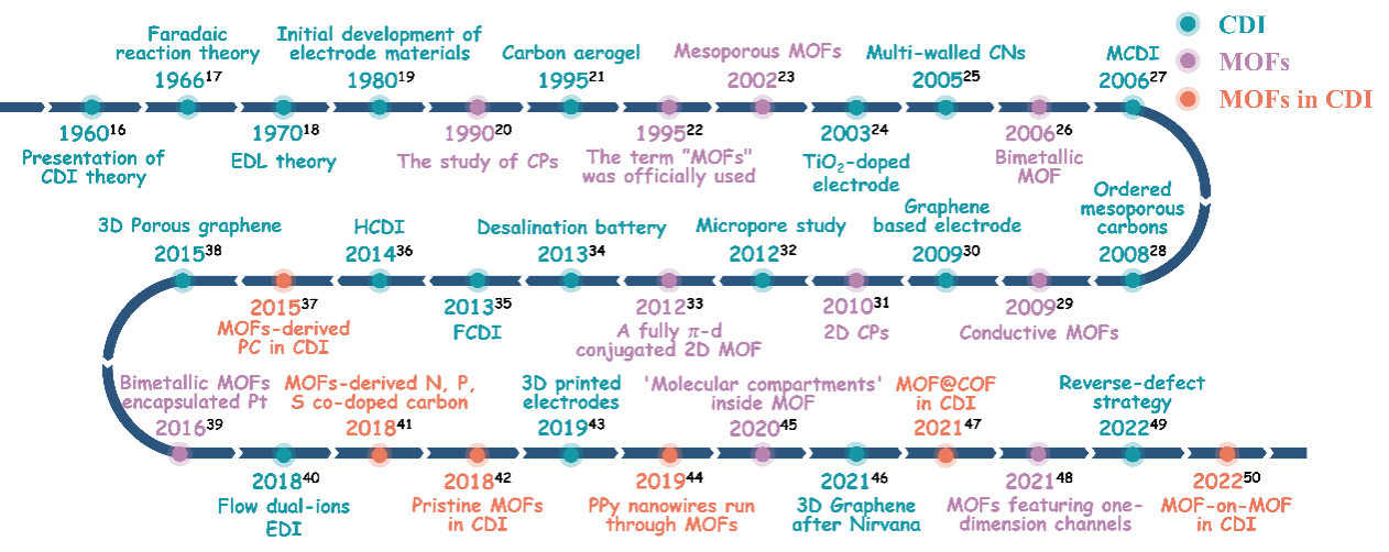 Figure1. Important scientific milestones in the development of CDI and MOFs / CPs materials since the inception of CDI in 1960.