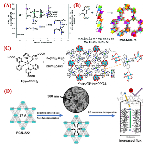 Figure 6. Bond length of the bound arm of the carboxylate group (OA-C) (Å) vs periodic group number for the transition metals. Abbreviations hs, ls and sq pl, correspond to high spin, low spin and square planar, respectively (A); Diagram of polymetallic mixed-metal (MM) MOF-74 (Metal nodes: Mg, Ca, Sr, Ba, Mn, Fe, Co, Ni, Zn, and Cd; Ligand: Dioxidoterephthalate, B); Schematic preparation process and structural configuration of Co4-Ir MOF (C) and Schematic diagram of pore environment tunable PCN-222 for nanocomposite reverse osmosis membranes (D).