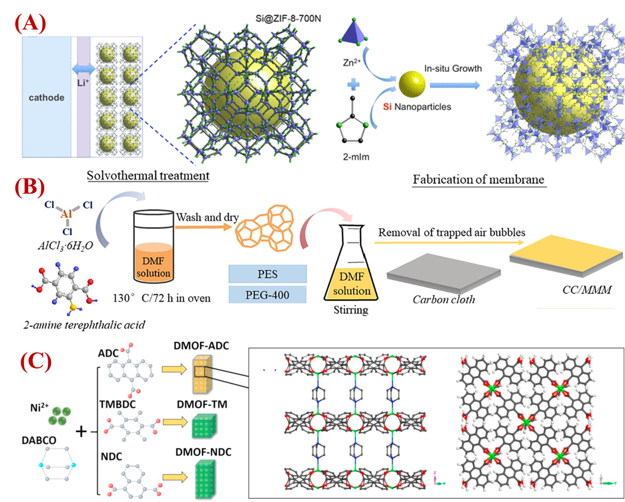 Figure 7. Schematic representation of the preparation of Si@ZIF-8-700N for anode material in LIBs. Black, green, blue and yellow balls refer to C, N, Zn and Si, respectively. After pyrolysis, ZIF-8 converts to amorphous carbon with monodispersed zinc ions (A); The flowchart of in-situ combined CC/MMM preparation process (B) and schematic illustration of the synthesis process of DMOFs and wireframe view of 3D Ni-DMOF-ADC along the (1, 0, 0) surface and the (0, 0, 1) surface. Blue, green and gray balls refer to N, Ni and C, respectively (C).