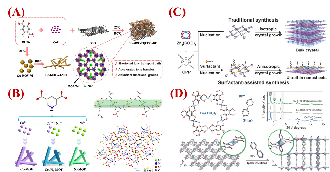 Figure 8. Schematical illustration of the synthesis process of Co-MOF-74|FGO-180 (A); Synthesis and cell schematic illustration of the syntheses of Co-MOF, CoxNiy-MOFs, and Ni-MOF (B); The traditional synthesis and surfactant-assisted synthesis of 2D MOF (C); Schematic diagram of the parent material Cu-THQ and selected pillar ligands (upper left). Synchrotron PXRD data of starting material (blue), pillar-inserted product (green), and simulated product pattern (gray), collected at beamline 17-BM (λ = 0.45237 Å, upper right). Modification of the 2D Cu-THQ synthesis to 3D Cu-THQ-BPY (bottom, D).