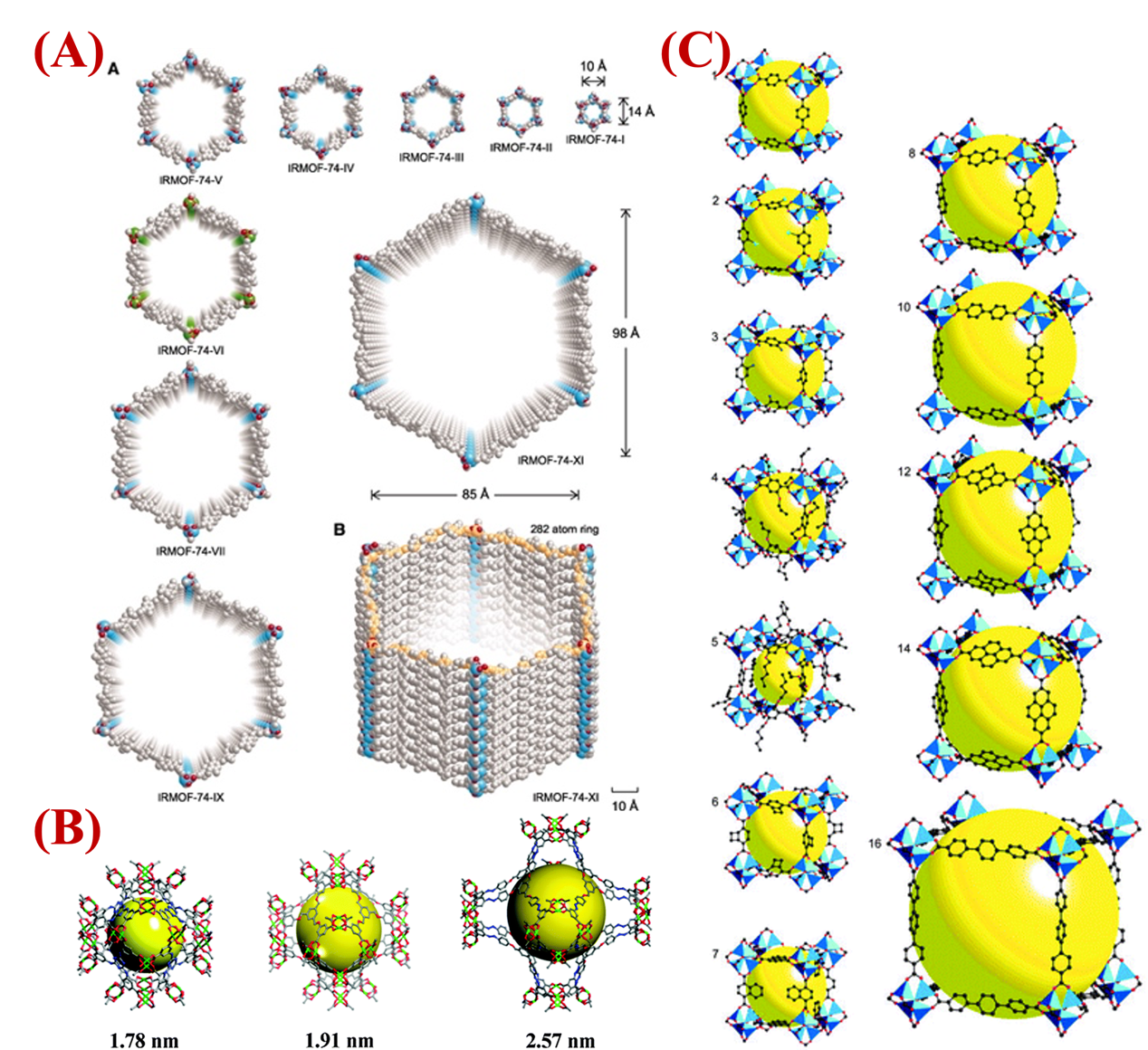 Figure 5. Crystal structures of IRMOF-74 series: Perspective views of a single one-dimensional channel shown for each member of IRMOF series, starting from the smallest (top right, A); The superoctahedra of rht-MOF-7 (left), rht-MOF-4a (middle), and rht-MOF-5 (right, B); Single crystal x-ray structures of IRMOF-n(n=1-7, 8, 10, 12, 14, 16) series. The yellow spheres correspond to the largest van der Waals spheres that would fit in the cavities without touching the frameworks (C).