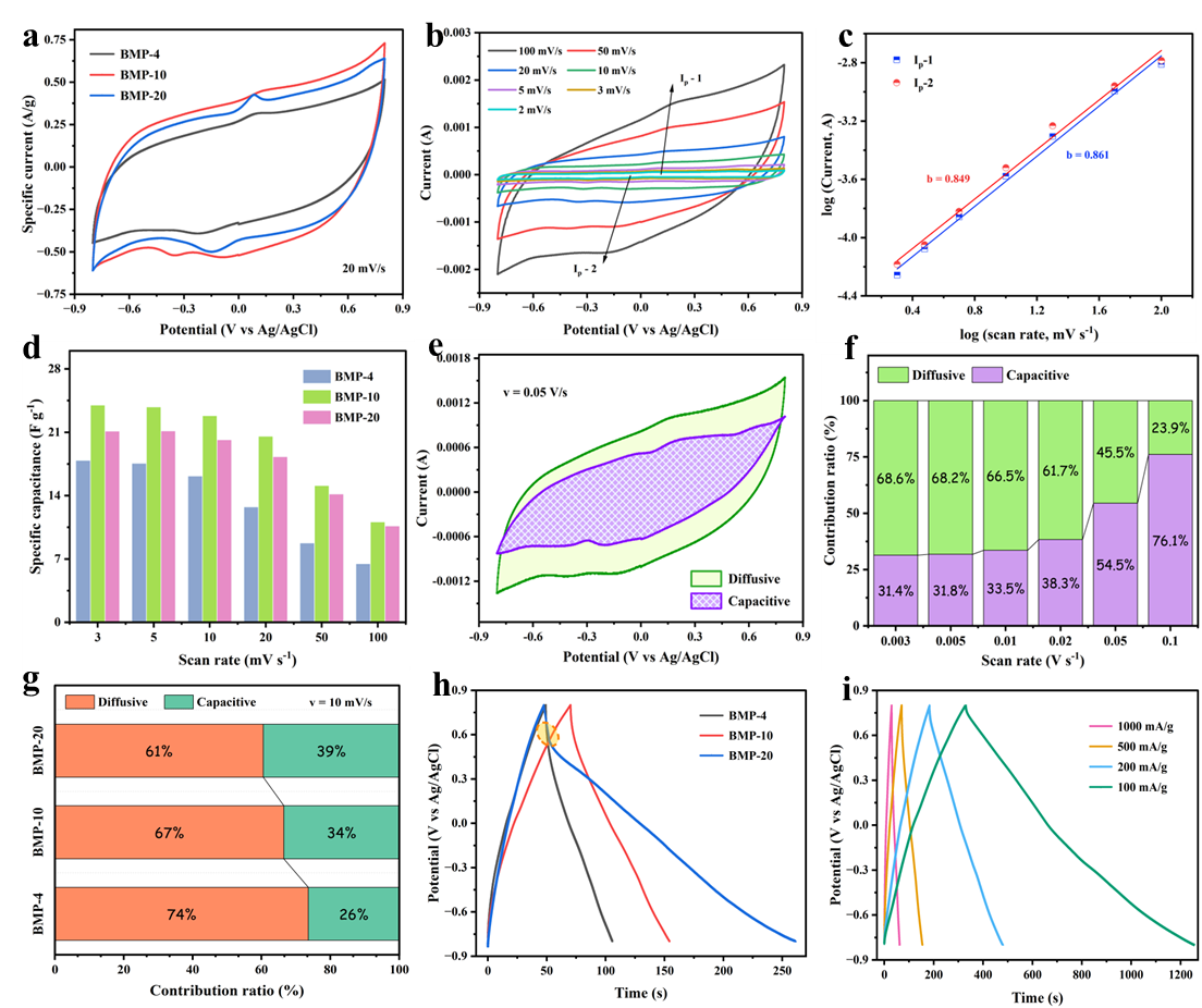 三种材料均在0.1 V和-0.15 V左右的位置存在一对氧化还原峰,说明MXene的含量对BMP在充放电过程中发生反应的性质没有明显的影响。在所有扫描速率下,BMP-10都表现出比BMP-4和BMP-20更高的比电容量,并且在3 mV s-1的条件下比电容最大,为24.0 F g-1。在相同的扫描速度下,BMP-4,BMP-10和BMP-20的电容贡献分别为26%,34%和39%,这是因为复合纳米材料中的MXene作为二维片层结构的材料具有插层赝电容的特性,所以MXene质量比的增加使得BMP-x的电容贡献占比相应上升。BMP-4和BMP-10的GCD曲线为较对称的等腰三角形,说明此二者材料具有较好的电荷效率,同时,BMP-10的充放电时间更长,反映了材料更高的比电容。而BMP-20在放电过程中具有明显的欧姆降(黄色圆圈部分),总体来看BMP-10具有最优异的电化学性能。