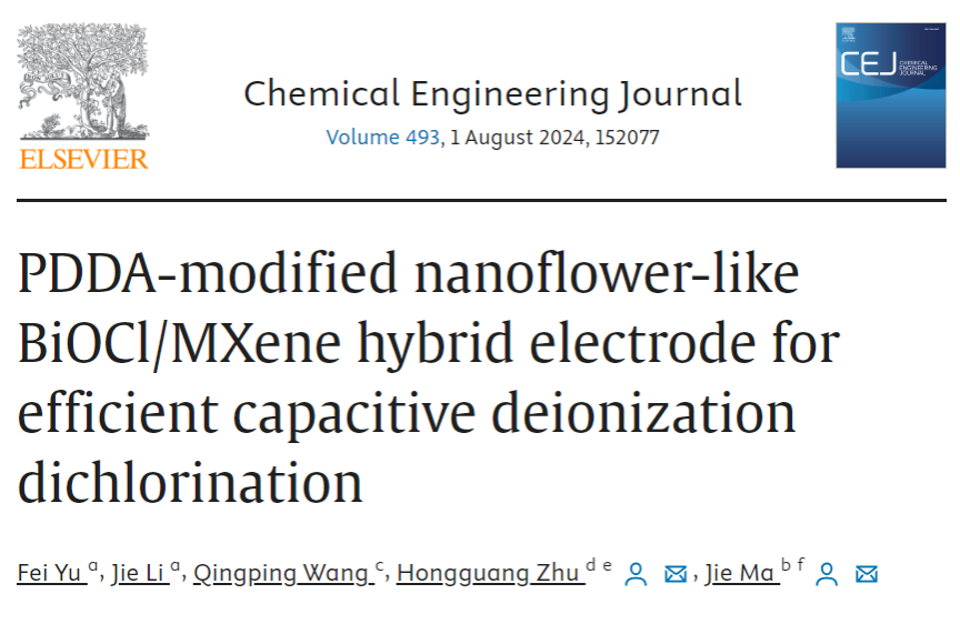 氯离子(Cl-)广泛存在于所有水源中,Cl-浓度升高通常会导致管道腐蚀以及将额外的重金属引入水中。制革、造纸、化工、垃圾填埋场、水产行业排放的废水中均含有大量的Cl-。工业用水占淡水消耗量的很大一部分,利用率较低,需要更加重视工业水的合理回收和再利用。然而,由于水循环周期增加,Cl-的存在提高了设备腐蚀的风险。因此,有必要设计制备有效的脱氯材料。2017年,铋(Bi)首次用作海水淡化电极活性材料。铋基电极(例如Bi/BiOCl对)在阴离子捕获方面表现出优异的电化学性能。然而,在脱氯过程中,Bi/BiOCl电极的体积变化和应力集中会影响Cl-在液固界面的传输和转化动力学。此外,铋基材料还存在导电性差、Cl-去除速率慢以及Cl-和钠离子(Na+)存储能力不匹配等问题。针对这些问题,本研究同时考虑了导电性、稳定性,并精细设计材料。我们使用PDDA作为一种强阳离子聚电解质来调节MXene的表面电负性,并提出了PDDA修饰的具有可控形态的BiOCl/MXene复合材料。该材料在脱氯过程中展现出优异的储氯容量、速率、能耗、电荷效率及稳定性。最大脱氯容量和速率为161.64 mg g-1和2.20mgg-1min-1。