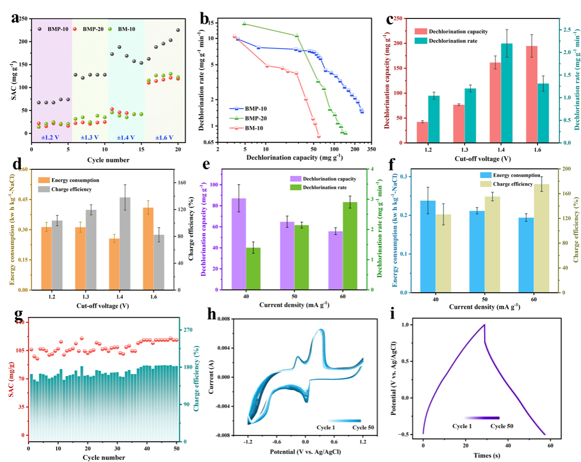 BMP-x的脱氯容量均随着截止电压下的上升而增加,BMP-10在所有截止电压下均表现出更好的脱氯性能,BMP-20和BM-10的脱氯性能差别不大,除了在截止电压为±1.4 V时BMP-20的脱氯容量略高于BM-10,在其他截止电压时,BM-10的脱氯容量大体上优于BMP-20。PDDA的修饰使得正电化后的MXene/BiOCl具有更高的反应动力学,Cl-在赝电容插层和转化反应过程中的电荷阻力减小,从而让BMP-10获得更加优异的脱氯性能。虽然BMP-10的脱氯容量与截止电压呈正相关,但当截止电压为±1.6 V时,其脱氯容量不稳定,这可能与H2O在较高电压下的电解和Cl2的产生相关。BMP-10能够更有效地进行脱盐,这表现为更高的脱氯容量和速率。
