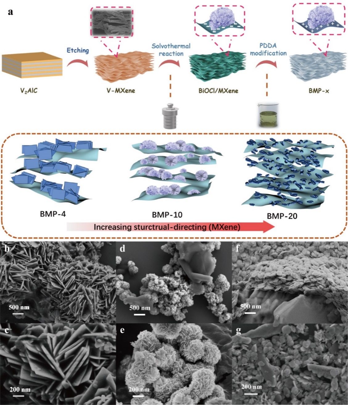 图1(a)PDDA修饰的BiOCl/MXene纳米结构的制备流程。BMP-4(b,c)、BMP-10(d,e)和BMP-20(f,g)的扫描电镜图像。