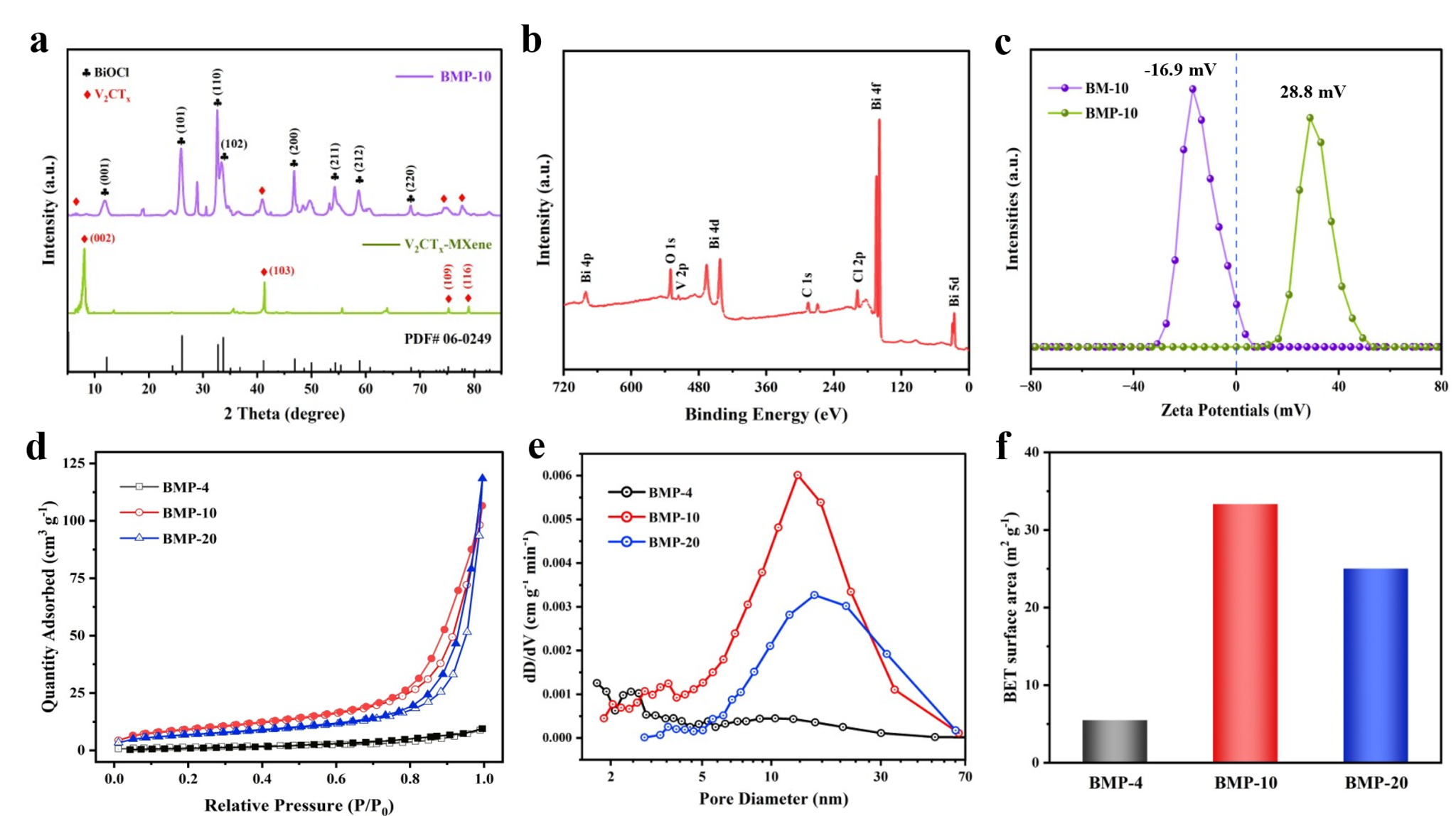 图2BMP-10的XRD (a)、XPS(b)、Zeta电位(c)和BMP-4、BMP-10、BMP-20的N2吸附脱附等温线、孔径分布和比表面积