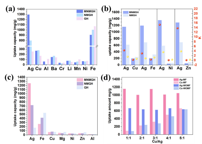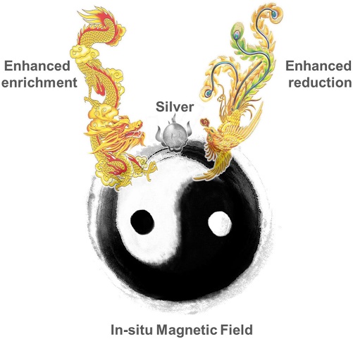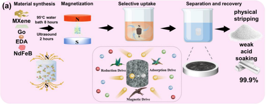 主流银回收方法存在资源浪费、银选择性弱、操作复杂等问题。本文采用自交联包覆法制备了自推进磁性增强捕获水凝胶(磁性NbFeB / MXene / GO,MNMGH)。MNMGH在酸性范围内实现了高选择性,并表现出超高的银回收能力,在原位磁场的辅助下,回收银的回收能力提高了66%。回收的银晶体可直接物理剥离,无需添加酸/碱。吸附的选择性筛分作用,MNMGH优先吸附Ag(I),然后选择性还原为Ag(0),实现双选择性回收。原位磁场通过增强传质,含氧功能团的活性来增强选择性吸附。此外,密度函数理论模拟表明,原位磁场可以降低银还原反应能垒,增强选择性还原。三驱动协同体系(还原驱动、吸附驱动和磁驱动)实现了超高的银回收性能。该研究开创了一种原位磁场辅助增强双选择性(吸附/还原)回收贵金属银的策略,为低碳回收工业废液中的贵金属提供了新思路。