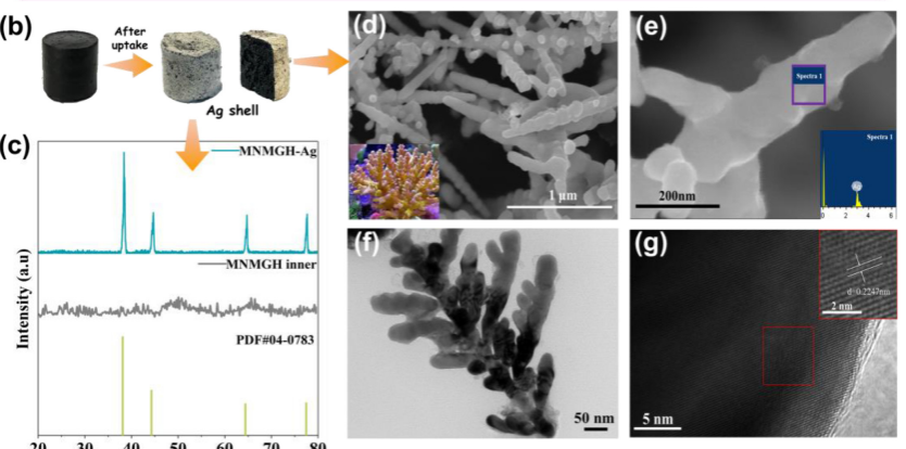 值得注意的是,图1d和e为银的SEM照片,可以看到多级分枝状形貌和结构,尖锐的茎部和不对称的分支,类似于珊瑚。此外,能量色散光谱仪(EDS)证明珊瑚树枝状银是银。从银晶体的TEM和相应的高分辨率TEM(图1f和g)可以看出,树枝状银的特征明显,相应的晶格间距为0.2247nm。这表明银晶体主要沿(111)面生长。珊瑚银的晶体形貌是MNMGH动态调控的结果,松散的树枝状结构有利于物理剥离。