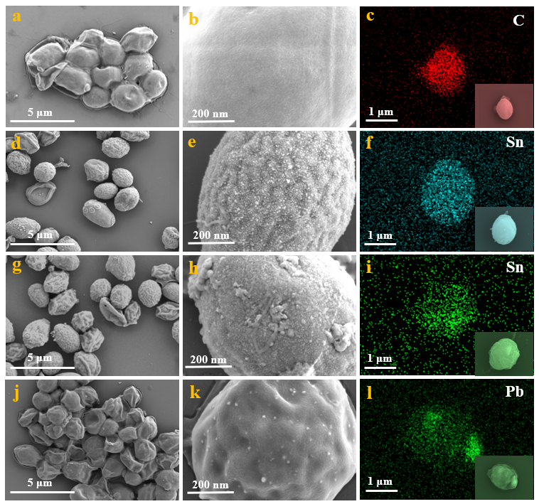 Figure 2.Structural information.SEM images and elemental mappings of pure yeasts (a-c), Sn(II)-adsorbed yeasts(d-f), Sn(IV)-adsorbed yeasts(g-i), and Pb(II)-adsorbed yeasts(j-l).