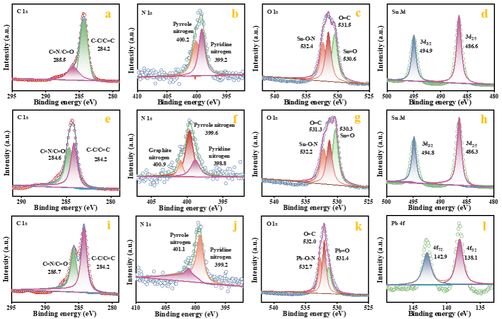 Figure 3.Capture and conversion of perovskite’s Mn+.XPS surface survey scan spectra of the samples.Sn(II)-adsorbed yeasts: (a) C 1s, (b) N 1s, (c) O 1s and (d) Sn 3d; Sn(Ⅳ)-adsorbed yeasts: (e) C 1s, (f) N 1s, (g) O 1s and (h) Sn 3d; Pb(II)-adsorbed yeasts: (i) C 1s, (j) N 1s, (k) O 1s and (l) Pb 4f.