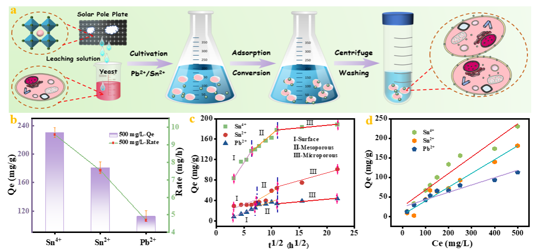 为了探究环境暴露后微生物对卤化钙钛矿中Mn+的去除作用,我们模拟了Pb(II)、Sn(II)及其氧化态Sn(IV)的吸附过程,这些物质在空气暴露下可以迅速从Sn(II)转化而来,如图1a和S1所示。为了研究酵母对钙钛矿浸出液中Mn+去除的影响,我们探讨了酵母对MX2和MAMX3(M: Sn / Pb,X: I / Cl)的处理效果。图S2显示,作为A位阳离子的有机盐可以显著提高Mn+的去除效果(提高了1/3)。通过考察不同卤素在金属盐中的影响,我们发现氯基金属盐的去除效率几乎是碘基金属盐的两倍,因此随后用于评估不同Mn+对钙钛矿太阳能电池(PSCs)的环境影响。图1b中的吸附结果显示,酵母对不同物质的吸附能力存在显著差异,其中Sn(IV)的吸附能力最高,为230.3 mg/g,其次是Sn(II)的180.9 mg/g,Pb(II)为112.7 mg/g。与其他研究相比,活化酵母对Pb(II)的吸附表现更为出色。例如,Neil Gershenfeld培养的酵母在初始Pb浓度低于百万分之一的溶液中显示了12 mg/g的吸附能力,而其他微生物对Pb(II)的吸附能力通常在5到70 mg/g之间。这表明酵母对Sn离子的去除效果更为有利。吸附过程通过初级和次级动力学模型进行了拟合,如图S3a-c和表S1所示。根据R2值的比较,次级动力学模型的拟合效果最好,表明在吸附过程中酵母与Mn+之间存在化学吸附。同时观察到,在初始阶段,液膜扩散主导了酵母表面,这一点从高线性度中可以看出。随着过程的进展,线性度保持不变,表明吸附扩散到酵母内部。在后期,线性度的下降暗示了接近吸附平衡。此外,拟合的直线没有超过原点,提示存在其他过程,如表面吸附、液膜扩散、外部扩散,以及粒内扩散等。
