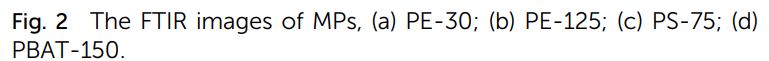 三种MPs在紫外线照射后均发生不同程度的光氧化反应。光利用率和氧含量越高,风化程度越大。ATR-FTIR谱图显示PE塑料在1720 cm-1处的C=O键随着照射时间的增加,特征峰也明显增大。PS的C-H键在光氧化过程中发生了不同程度的变化,表层化学成分发生变化。PBAT的C-H键振动强度随风化时间增加而减小,碳链发生交联或重排。