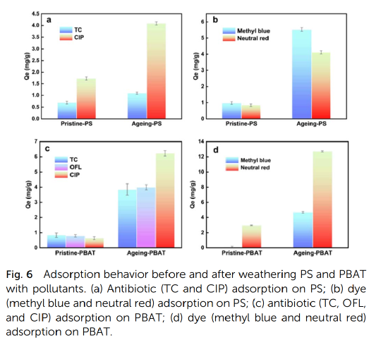 PS对染料的吸附能力高于对抗生素的吸附能力。原始PS主要通过疏水π-π共电子相互作用吸附污染物。光氧化反应加速风化过程,导致引入C=O、C-O或O-H基团,改变MPs的物理化学性质,从而增强MPs与污染物之间的氢键。因此,紫外线辐射显著增强了PS对污染物的吸附能力。老化后,PS对TC、CIP、中性红和亚甲基蓝的平衡吸附量分别增加了58% (0.69 ~ 1.09 mg g−1)、138% (1.72 ~ 4.09 mg g−1)、381% (0.85 ~ 4.09 mg g−1)和469% (0.97 ~ 5.52 mg g−1)。PBAT在风化前后的吸附能力有显著差。PBAT对CIP的平衡吸附量从0.62 mg g−1增加到6.22 mg g−1,对中性红的平衡吸附量从2.92 mg g−1增加到12.70 mg g−1。这表明PBAT比常规微塑料具有更强的污染物负荷能力。
