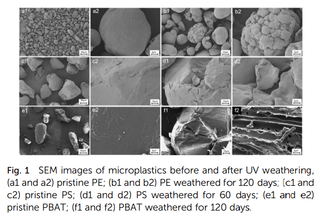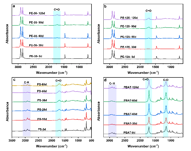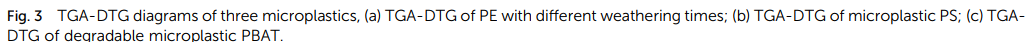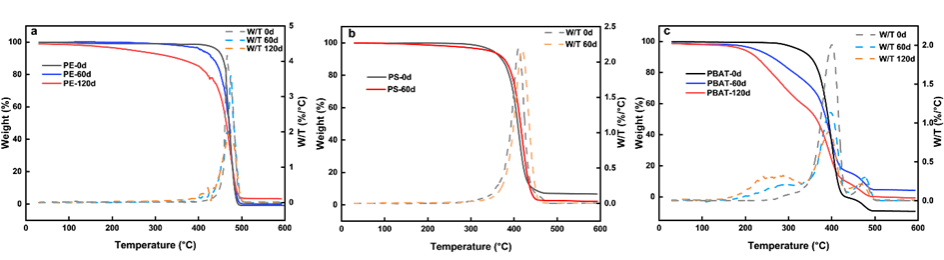 根据DSC曲线数据,原始PE样品的结晶度为13.0% 120天后PE的结晶度为47.1%。在加速风化过程中,不稳定的非晶态区域被破坏,留下更稳定的晶态区域。PS在风化前后保持相对稳定,风化后的热稳定性增强。PS颗粒表面碎片脱落,剩余碳链在熔化时需要更多的能量,紫外风化后残留的PS不易降解,更容易产生微塑料污染物持续的复合污染效应。PBAT风化后峰值向低温迁移,热稳定性降低。此外,PBAT的碳链发生交联,产生二苯甲酮结构,促进非生物因素和生物降解。