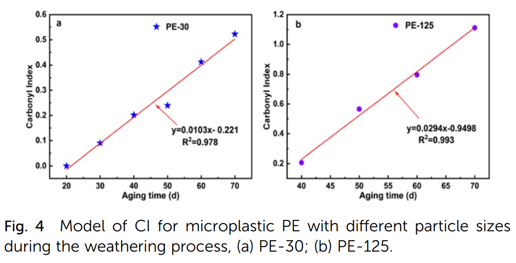 对两种粒径的PE微塑料建立CI预测模型,随着老化时间改变,PE的CI呈现良好的线性拟合关系,PE-30和PE-125的拟合度分别为0.978和0.99。为了验证模型的准确性,对比了PE老化的第80、90和100天的预测值和实测值的标准偏差均在0.09以下。