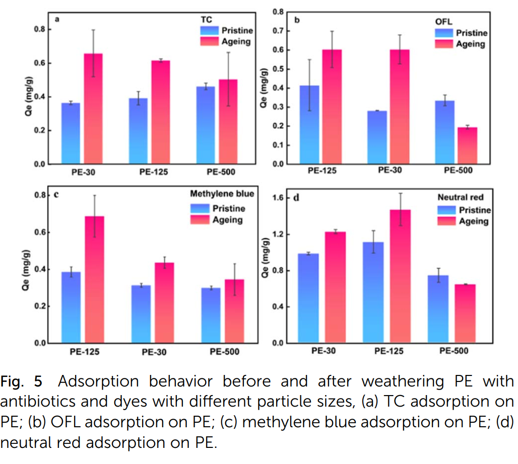 PE-125对不同污染物表现出较高的吸附能力。PE在老化后引入了含氧官能团增加了微塑料的亲水性。对TC、OFL的吸附主要通过氢键作用。PE老化后对中性红的吸附容量最高,主要通过物理吸附结合。