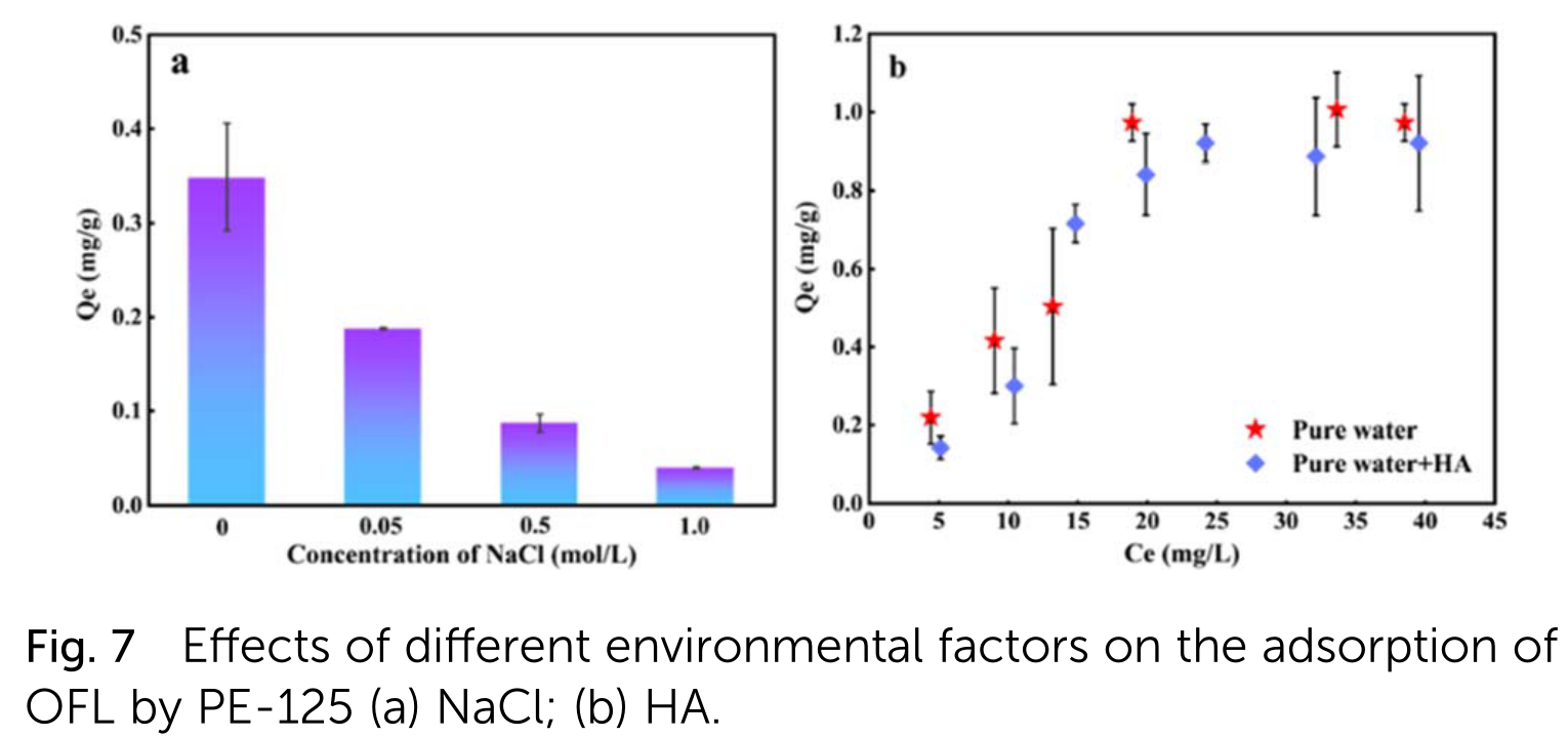 随着氯化钠浓度的增加,PE-125吸附行为受到抑制。盐离子与污染物之间的离子竞争削弱了微塑料的吸附能力。有机物的存在也会降低微塑料对抗生素的吸附能力。腐植酸(HA)含有多种芳香族物质,其活性官能团与微塑料具有疏水相互作用和络合作用。因此,微塑料与OFL之间的界面相互作用被削弱。此外,透明质酸可以通过络合和氢键与亲水性和极性有机化合物相互作用。