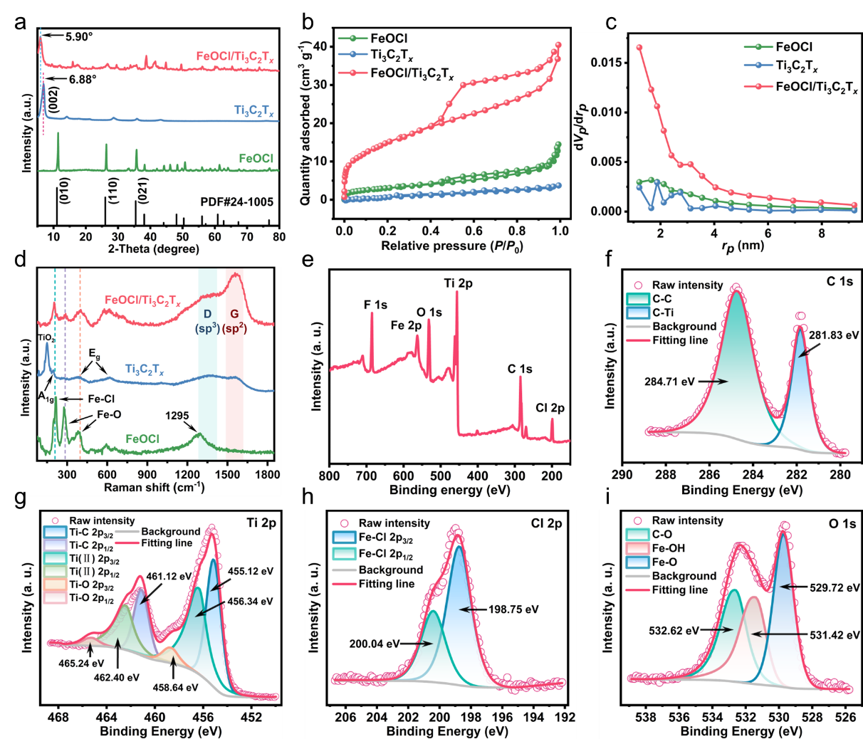 从XRD、Raman、BET、XPS等表征结果(图2)可知,FeOCl/MXene通过静电自组装成功复合,并且两者互相协同展现出优越的多孔结构、亲水性能以及结构稳定性。