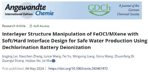 通过软/硬界面设计控制层间结构首次将FeOCl用于水系电化学脱氯。Ti3C2Tx辅助成膜方法避免了FeOCl的分解。Ti3C2Tx提高了阳极电极的电荷转移效率和结构稳定性。同时,FeOCl作为纳米柱嵌入Ti3C2Tx层间,支撑起易堆叠的Ti3C2Tx片层,并通过静电组装中和其表面不利于脱氯的负电荷。FeOCl/Ti3C2Tx的分级微-介孔结构和优异的电化学性能使其表现出优异的脱氯性能和可观的能量回收。提出了基于充放电过程中Fe2+/Fe3+可逆拓扑化学转化的FeOCl脱氯机理。采用原位原子力显微镜、电化学膨胀法和有限元法验证了Ti3C2Tx对FeOCl的变形约束作用。这项工作展示了硬-软界面独特的成分和结构梯度,为开发新型、稳定的电化学除氯电极开辟了一条新途径。