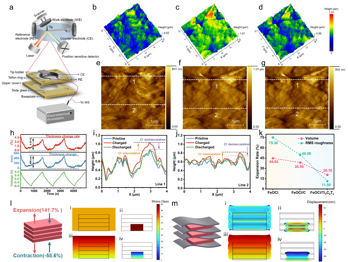 图5 原位技术与仿真计算探究FeOCl/Ti3C2Tx电极的结构变形机制