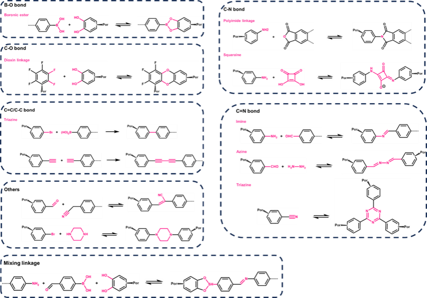 用于基于卟啉的共价有机骨架 (COF) 的合成方法与用于其他 COF 材料的合成方法非常相似。热力学控制共价化学 (DCC) 是生成高度结晶 COF 结构的基本原理。 这种方法依赖于具有有序堆叠的 COF 的热力学稳定性,超过了小分子两性离子或无定形聚合物。因此,DCC 反应倾向于产生具有优异结晶形态的 COF,其中共价键经历动态过程 断裂、转化和再生以达到热力学稳定状态。在卟啉基 COF 的合成中,共价键的形成取决于卟啉单体和连接体内的官能团。 图2说明了具有醛、氨基、氟、末端炔、羟基和羧基的卟啉衍生物(Por-1-8)的制备。 这些衍生物与特定的催化连接体发生反应(图 3),形成多种共价键。 在整个过程中,不断地识别和结构缺陷的修复发生——连续的“自我诊断”和“自我修复”机制——产生具有晶体结构的有机框架。卟啉分子的刚性和平面性有助于 COF 的优异可控性和结晶度 衍生自卟啉构件。然而,由于卟啉的复杂拓扑结构,据报道用于合成基于卟啉的 COF 的前体数量有限。 代表性方法包括硼酸酯缩合、三嗪缩合和酰亚胺缩合。值得注意的是,近年来出现了山本自偶联反应、立方酸胺缩合和一锅酯化反应等创新方法,拓宽了 COF 的合成可能性。