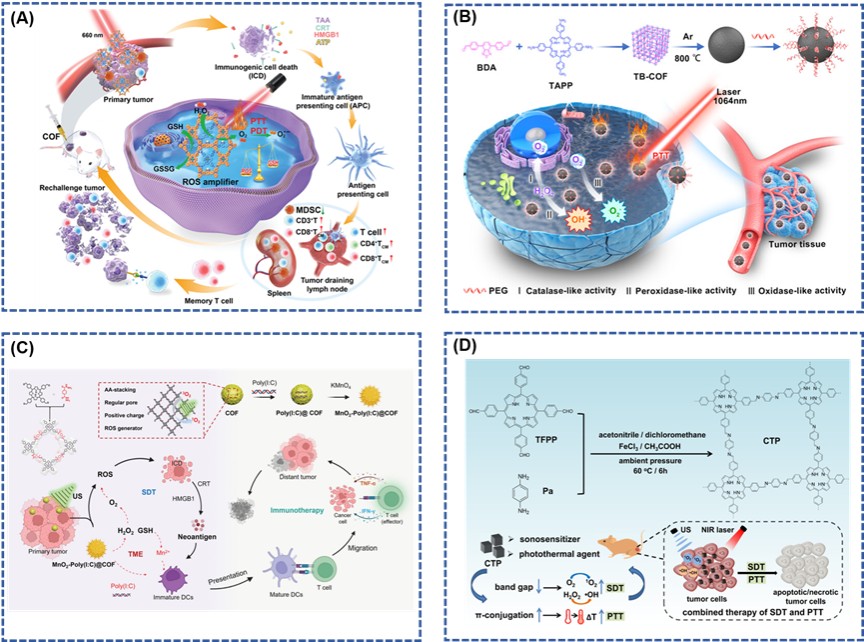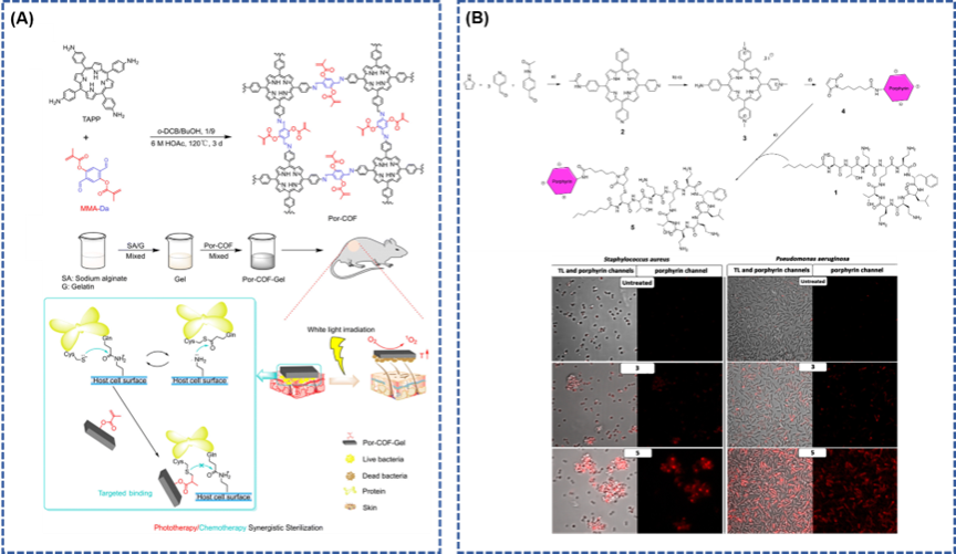 光动力抗菌疗法 (PDAT) 作为一种有前途的细菌性疾病治疗策略,已成为研究领域的焦点。这种方法具有显着的优势,包括减少治疗副作用和增强抵抗耐药性的能力。近些年来,光学技术的发展,加上创新光敏剂的发展,推动 PDAT 成为对抗耐药细菌感染的引人注目的解决方案。 在 PDAT 中,光敏剂,如卟啉、苯酞和吲哚菁,通过将光能转化为热能或活性氧 (ROS),从而对细菌产生不可逆的损伤,发挥着关键作用。光动力疗法 (PDT) 的功效 取决于病变部位光敏剂的浓度。实现这些光敏剂的高密度积累对于引发显着的热效应并确保成功的光疗至关重要。尽管传统光敏剂(例如单个自由可用的卟啉分子)具有潜力,但其固有的自聚集引起的爆发提出了挑战,导致PDT的有效性急剧下降。 这种限制促使人们探索替代解决方案。在这种背景下,基于卟啉分子的共价有机框架(COF)已成为细菌光疗的强大光敏剂。 这些 COF 成功地克服了阻碍单个卟啉分子功效的自聚集性质。基于卟啉的COF 的独特结构和特性使它们成为增强光动力灭菌过程的有希望的候选者,解决与传统光敏剂和光敏剂相关的局限性。为先进的细菌感染治疗开辟新途径。
