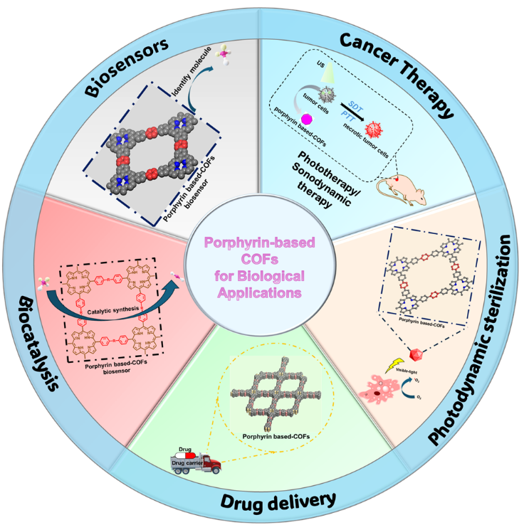 共价有机骨架(COF)是一类由轻质元素通过共价键互连组成的高功能多孔材料,具有结构有序、高结晶度和大比表面积的特点。 天然存在的卟啉分子以其固有的刚性和共轭平面性而闻名,作为 COF 的构建模块,其整合引起了人们的广泛关注。 这种策略性的结合解决了与独立卟啉相关的局限性,从而产生了具有分子水平定向排列的组织良好的多孔晶体结构。 卟啉分子固有的独特的光学、电学和生化特性赋予这些 COF 多样化的应用,特别是在生物学领域。 这篇综述全面探讨了卟啉基 COF 开发中采用的合成和调制策略,并深入研究了它们在生物背景下的多方面应用。 按时间顺序描述了从设计到应用的演变,并分析了现有的挑战。 此外,这篇综述为卟啉基COF的结构设计提供了方向性指导,并强调了它们在生物学领域的广阔前景。