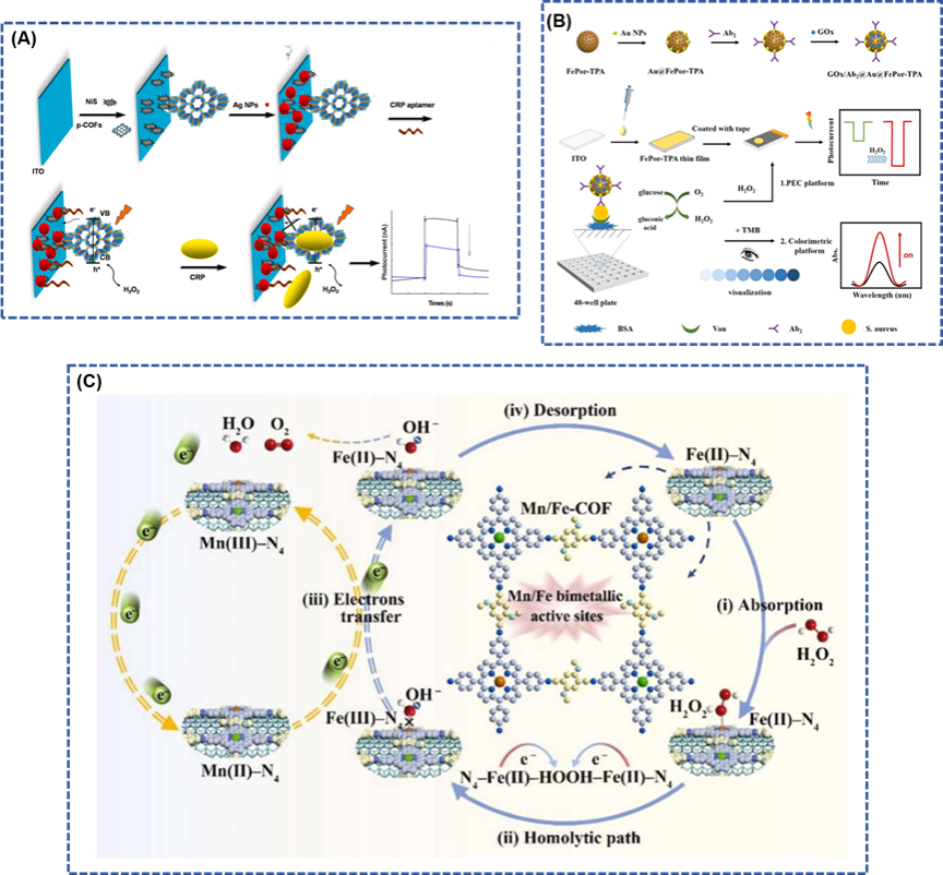 卟啉分子以其出色的光敏性和稳定性而闻名,事实证明,它擅长通过电化学过程或各种光谱方法(包括紫外、红外、荧光、磷光和拉曼)识别光电信号的微小变化。这种独特的能力有助于检测目标分子并得出分析结论,为光电化学生物传感器领域的应用提供了令人信服的机会。然而,采用纯卟啉分子作为光电反应实体的生物传感器在发光效率方面遇到了限制。 二维层状纳米结构的独特性质,包括减少电荷转移时间和距离以及独特的光学和电学特性,使其成为光电化学生物传感的理想选择。 基于卟啉的共价有机框架 (P-COF) 将天然卟啉分子作为构建单元,为这些用于生物检测的二维材料引入了增强的生物功能。例如,Cui等人开发了一种基于适配体的电化学传感器来检测大肠杆菌。该传感器采用基于卟啉的共价有机框架 (TPH-TDC-COF),由 5,10,15,20-四(4-氨基苯基)-21H,23H-卟啉 (TPH) 和 [2,2'- 联噻吩基]-2,5'-二甲醛(TDC)。TPH-TDC-COF的高度共轭结构,以及良好的导电性、大表面积和增强的生物相容性,显着提高了其锚定大肠杆菌靶向适配体的能力。 在最佳条件下,这种电化学适体传感器对大肠杆菌的检测限为 0.17 CFU mL−1,线性范围为 10 至 1 × 108CFU mL−1。