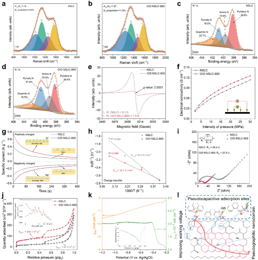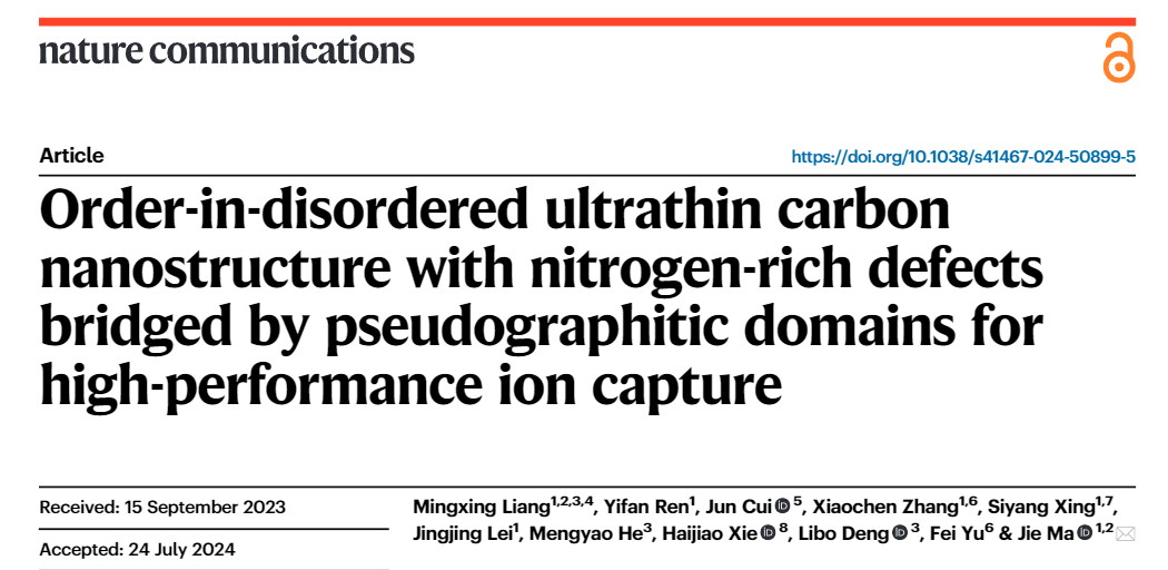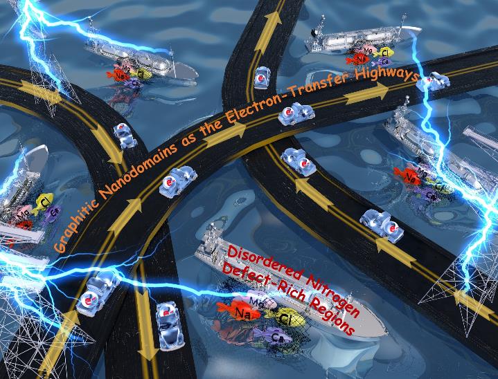 氮掺杂是一种提高碳材料无序度,增加活性位点的有效方法,而掺氮量被认为对碳材料电化学容量提升具有重要影响。氮掺杂量太低,无法提供足够的赝电容结合位点;掺氮量太高,则会导致电子转移能力恶化。因此,实现掺氮量与本征导电性之间的权衡充满挑战。有鉴于此,同济大学/喀什大学马杰教授团队利用超分子自组装策略,在高含氮前驱体尿酸分子中引入热不稳定基本单元三聚氰胺,从而在高温下产生丰富的纳米气泡,在纳米气泡表面张力的作用下,诱导形成石墨碳纳米畴,最终得到“有序-无序”的碳纳米域结构,在增加掺氮量的同时,提高了碳材料的电子转移性能。得到的高氮掺杂(含氮量21.9 at%)的类纳米片碳在微咸水和实际工业循环冷却水中展现了优异的电化学脱盐性能。相关成果发表在国际权威学术期刊《自然·通讯》(Nature Communications)上。