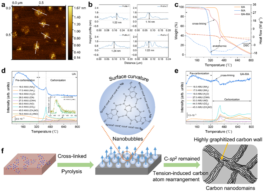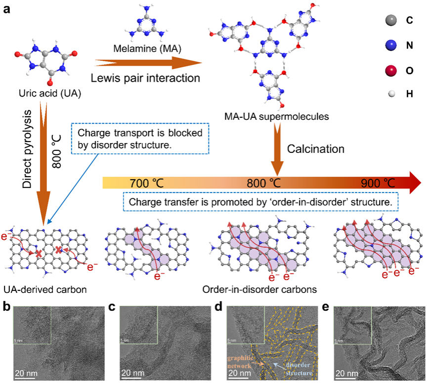 以尿酸(Uric acid,UA)为热解前驱体,可得到富氮掺杂的碳材料,但其本征导电性较差,导致电荷传输受阻。因此,该研究在尿酸中引入三聚氰胺(Melamine,MA),基于路易斯酸碱对和p-p相互作用自组装形成MA-UA超分子结构。耦合差分扫描量热的热重-质谱联用技术分析表明,高温下,引入三聚氰胺作为基元结构后,会在尿酸分子的边界处产生大量纳米气泡。在表面张力作用下,纳米气泡会促进碳原子的有序重排,从而在碳材料内部形成伪石墨畴结构(Pseudographitic domains)。高分辨透射电镜图和原子力显微镜分析揭示,所得到的“有序-无序”类纳米片碳(O/D NSLC)呈现有序的伪石墨纳米畴嵌入到无序碳中的结构,碳纳米片的厚度约为1.2 nm,大约是单层或双层氧化石墨烯的厚度。