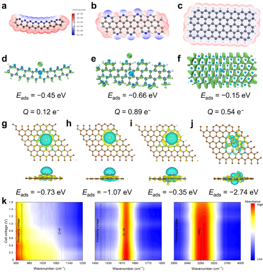 高斯模拟计算结果证实了氮掺杂耦合石墨纳米网络的碳结构对钠离子的吸附能最小(绝对值最大),意味着该结构与钠离子相互作用更强。另外,密度泛函理论计算表明,相比单一的氮物种,多边缘型氮物种耦合的氮构型(吡咯氮、吡啶氮、氨基氮及氰基氮)对钠的吸附能和扩散能垒更小,证明多边缘型氮构型可以显著提升离子电吸附容量和动力学。原位衰减全反射傅里叶红外光谱(ATR-FTIR)测试揭示了在电场作用下C―N、C=N、―NH2氮物种对离子的吸附机制。