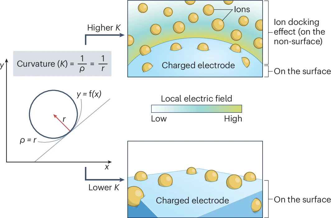 马杰教授课题组受邀在Nature Water期刊“News & Views”专栏撰写题为“Ion docking with a twist”的文章。该文章评述了浙江海洋大学徐兴涛教授、名古屋大学Yusuke Yamauchi教授和上海交通大学麦亦勇教授团队在电容去离子(CDI)水净化领域的最新研究成果(Nat. Water (2024). https://doi.org/10.1038/s44221-024-00340-4)。该研究通过曲率工程强化了基于“非电极表面”的离子储存机理(Ion docking effect, IDE),材料曲率变化调控了电极表面局域电场强度,实现了离子浓度局部富集,显著提升了CDI的离子存储能力,突破了传统基于“电极表面”的法拉第/非法拉第离子储存机理容量限制,实现了超高效的水净化效果。