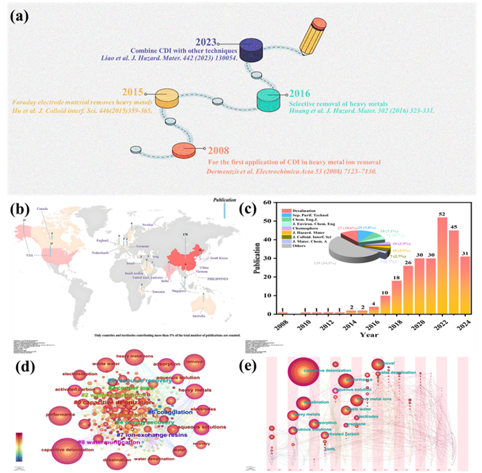 通过CiteSpace数据可视化展示2008-2023年CDI在重金属领域的研究趋势。图2a时间轴显示技术从基础脱盐向重金属选择性分离的转型;图2b-d揭示中国在该领域的主导地位(发文量占比>60%),关键词聚类表明“选择性分离”与“资源回收”是当前核心议题。