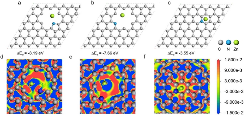3.1.离子筛分:碳电极的孔径与结构是离子选择性吸附的关键。当电极孔径小于重金属离子的水合半径时(如Cd⟡⁺ 4.26 Å),离子无法有效进入孔隙,而水合半径较小的Na⁺、K⁺优先被吸附(图5)。此外,高价态离子(如Pb⟡⁺)因静电吸引力更强,在相同孔径下更易被捕获。Huang等人通过微波热解结合KOH活化制备氮磷共掺杂分级多孔生物炭(STC),其表面缺陷与极性官能团显著提升Cu⟡⁺吸附量(以化学吸附为主)。Xu等人以蚕茧为原料合成氮掺杂多孔碳(NPC),在Ca⟡⁺/Mg⟡⁺/Zn⟡⁺混合溶液中仍对Zn⟡⁺保持高选择性,DFT模拟(图5a-f)揭示吡啶氮位点与Zn的强键合作用,电子密度差分图显示电荷从Zn向碳层转移。研究指出,离子电荷与水合半径的协同作用是筛分选择性的核心,但学界对“理想孔径”仍存争议,未来需结合理论计算与实验进一步验证。