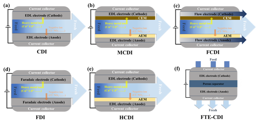 对比常规CDI、膜CDI(MCDI)、流动电极CDI(FCDI)等六种构型(图3a-f)。重点解析MCDI通过离子交换膜抑制共离子效应,FCDI利用流动电极实现连续操作,为不同场景下的重金属处理提供技术选型依据。