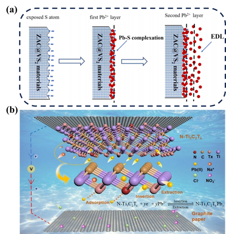 3.4螯合效应:功能化电极通过表面官能团与重金属离子的特异性配位实现选择性吸附。Liu等人制备的ZAC@VS₂复合材料中,VS₂的硫活性位点与Pb⟡⁺通过软硬酸碱作用强结合(图8a),竞争实验显示其对Pb⟡⁺的选择性高于Cd⟡⁺/Zn⟡⁺。Wang团队设计的氮掺杂MXene(N-Ti₃C₂Tₓ)通过Ti-OH与Pb⟡⁺络合,在Ni⟡⁺/Cu⟡⁺/Pb⟡⁺混合液中仍保持超高去除率。Chen等人合成的磷化硼纳米片凭借P原子与U(VI)的强配位,即使干扰离子浓度百倍于U(VI)仍实现高效吸附。螯合机制的核心是设计具有特定软硬度或空轨道的活性位点,未来需结合机器学习预测最优配位基团组合。