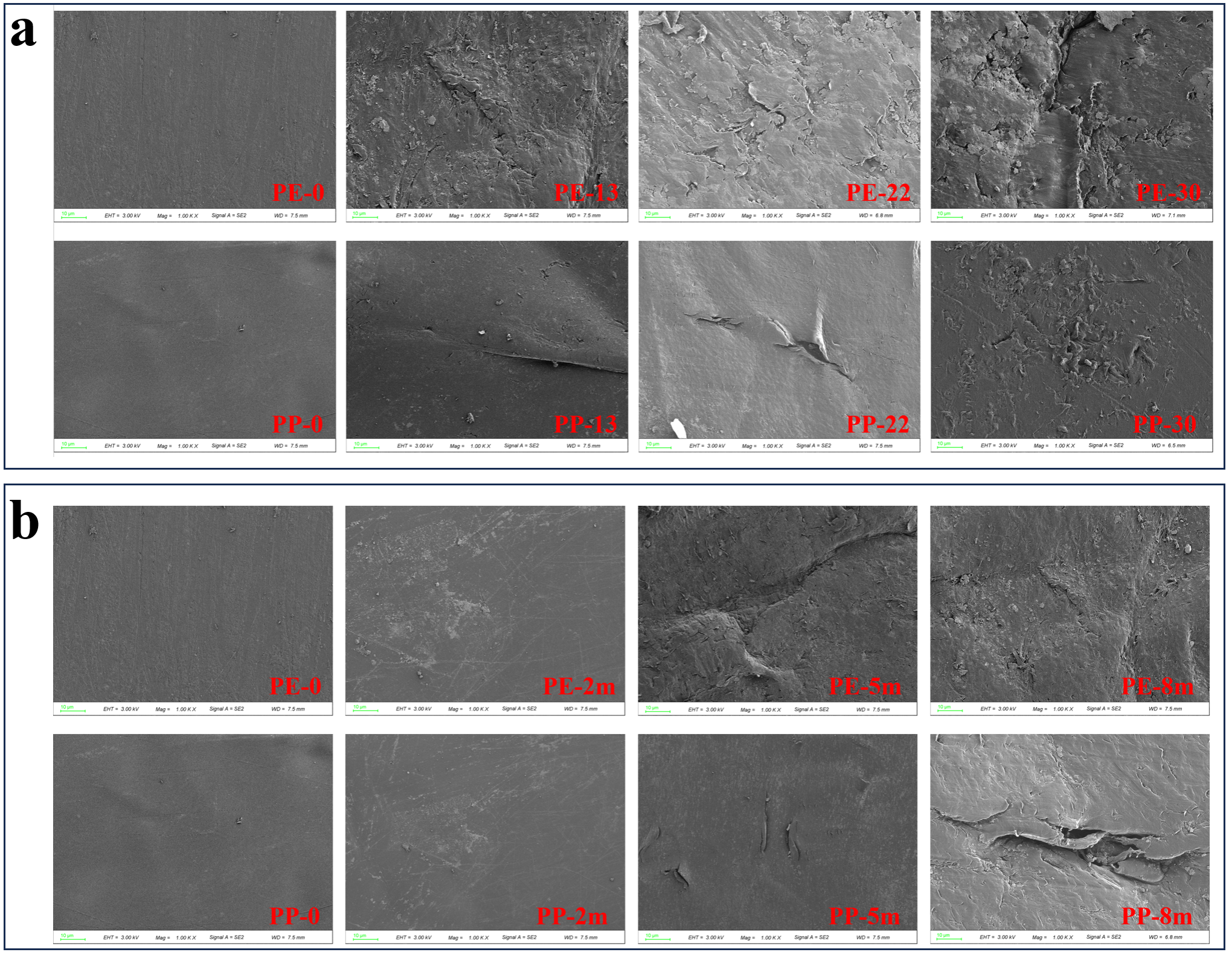 图6,废塑料表面形态的变化。(a) 两种废塑料表面形态随填埋时间的变化。(b) 两种废塑料表面形态随填埋深度的变化。
