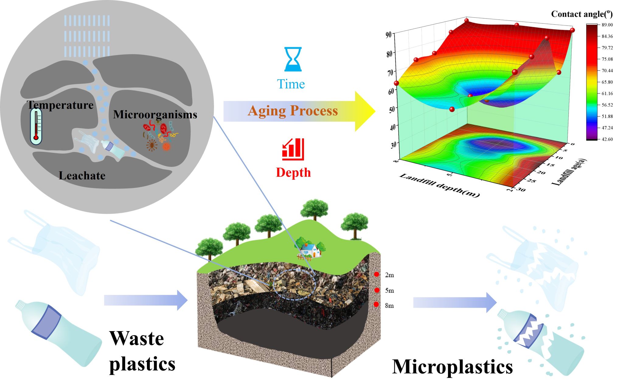 本研究通过分析不同填埋年龄和深度的废弃塑料的老化、亲水性、机械性能、表面形态和元素变化,揭示了填埋时间和深度对塑料物理化学性质变化的显著影响。并且通过3D矩阵分析对各种理化性质进行分析探究了填埋场废塑料理化性质的时空分布特征。这篇论文通过系统的实验和分析,为塑料污染的管理和后续研究提供了重要的科学指导。