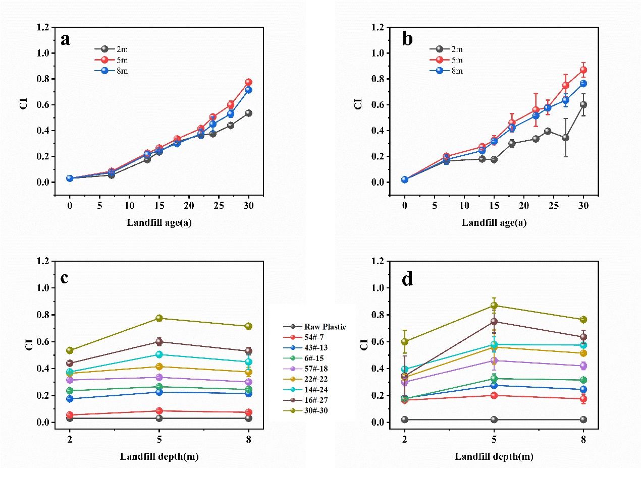 图2,塑料废弃物的CI随时间的变化:(a) PE随填埋时间的变化 (b) PP随填埋时间的变化 (c) PE随填埋深度的变化 (d) PP随填埋深度的变化
